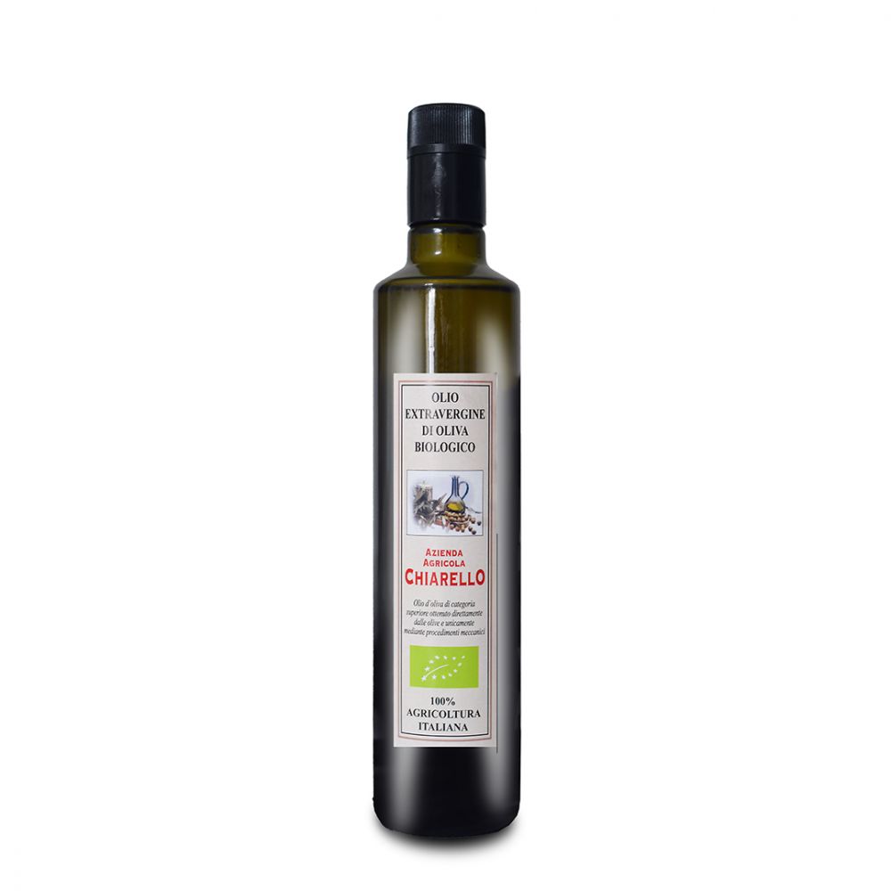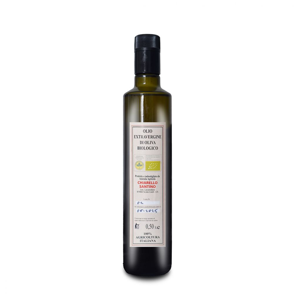 Bottiglia di Olio extra vergine da 0,5 litri ottenuto da olive coltivate, raccolte e molite in Italia secondo i rigorosi dettami dell'Agricoltura Biologica e certificato dall'ente ICEA, il nostro BIO è un ingrediente da portare in tavola fresco, sano e sicuro, dal sapore corposo e con una bassa acidità, indicato nella dieta di bambini ed anziani per le sue elevate proprietà organolettiche.
